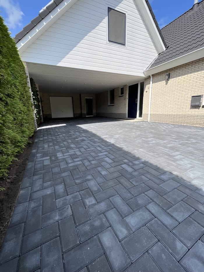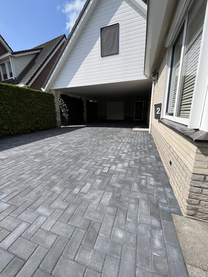 De oude oprit was smal, verzakt en vol onkruid. Door de volledige oppervlakte te vernieuwen en iets te verbreden ontstond niet alleen ruimte voor twee auto’s naast elkaar, maar ook een mooie overgang naar het terras aan de zijkant. Het resultaat? Een royale entree die direct rust en kwaliteit uitstraalt.