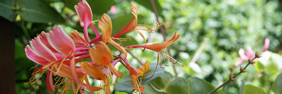 Een tuin waarin lage en hoge begroeiing varieert, bloei zich afwisselt en iets te beleven valt is het mooist. Een vijver, vruchtbomen, een tuinkamer of klimmers (geurende kamperfoelie, foto) geven levendigheid. Hulp nodig? Wij kennen ons vak!